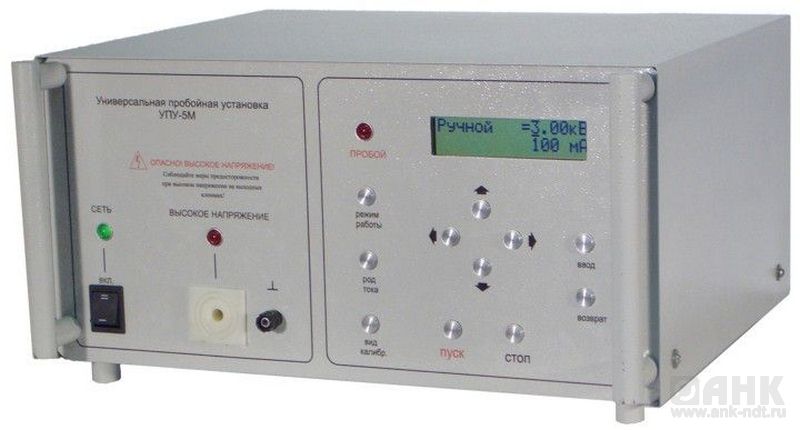 Универсальная пробойная установка УПУ-5М представляет собой прибор для измерения электрической прочности изоляции при испытании постоянным или переменным напряжением. УПУ-5М прибор настольного исполнения. Установка УПУ-5М выпускается в двух вариантах исполнения: — универсальный (У) с возможностью испытания как переменным так и постоянным напряжением — переменный (П) с возможностью испытания только переменным напряжением. Второй вариант имеет больший ресурс.