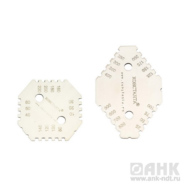 Гребенка имеет две опорные базы на каждой из граней и набор выступов с фиксированным зазором относительно баз. Величина зазора отмечена на выступе. За толщину покрытия принимается величина зазора между опорной базой и между значениями толщины, мкм, указанными на паре окрашенного и неокрашенного выступов.