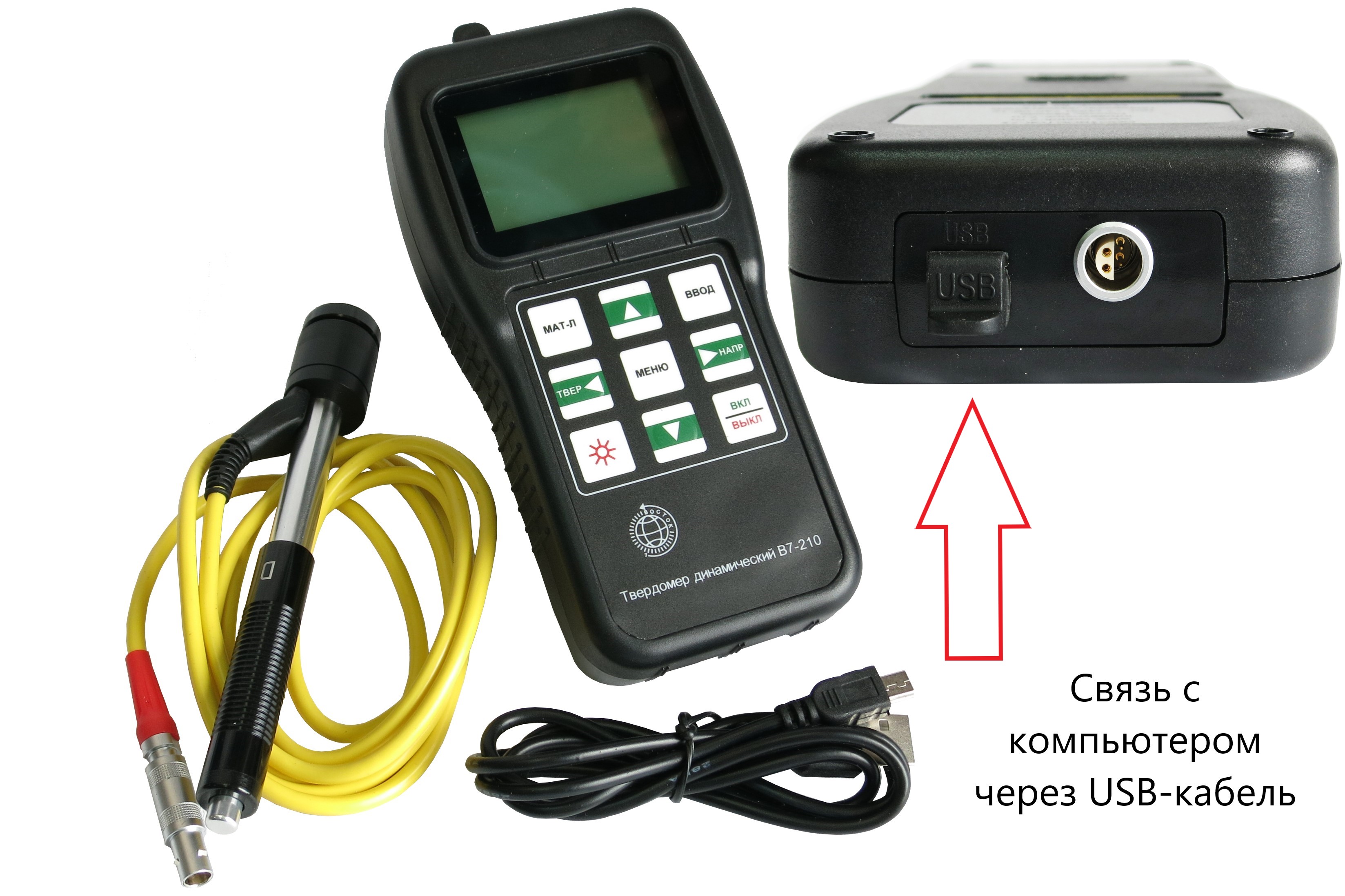 В7-210 - твердомеры в раздельном виде составных частей: электронный блок и съёмный датчик тип D, подключаемый к электронному блоку соединительным кабелем. Электронный блок твердомера позволяет обмениваться данными с компьютером через USB-порт (на заказ). Измерение твёрдости по шкалам Роквелл, Бринелль, Виккерс и Шора D (HR, HB, HV и HSD соответственно). Имеется 6 типов дополнительных датчиков под заказ для измерения твёрдости в специализированных условиях. Питание - заменяемые батареи тип АА.