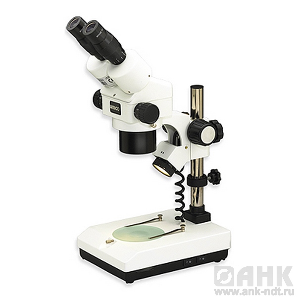 Тринокулярный стереомикроскоп ZOOM UNICO ZM 181 с плавным увеличением изображения. Оснащен окулярами для пользующихся очками, имеет подстройку диоптрий для двух глаз раздельно, штативом с вращающейся на 1800 насадкой с головкой для просмотра крупных объектов, дополнительной флуоресцентной лампой для освещения без нагрева.