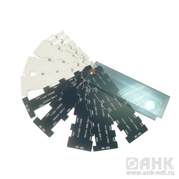 • Из набора пластин шаблона выбирается пластина с соответствующими контролируемому стыку параметрами: марка полиэтилена (ПЭ80 ил ПЭ100) диаметр и толщина стенки свариваемых труб;