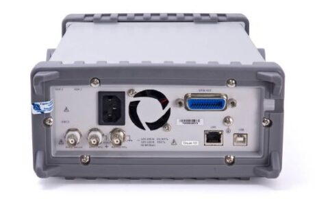 На задней панели частотомеров расположены — разъем для подключения сетевого кабеля, входной разъем внешнего запуска, вход 10 МГц для подключения внешнего источника тактовой частоты 10 МГц, выход 10 МГц с внутреннего опорного генератора, интерфейсы дистанционного управления USB и LAN, гнездо для установки опционального интерфейса.